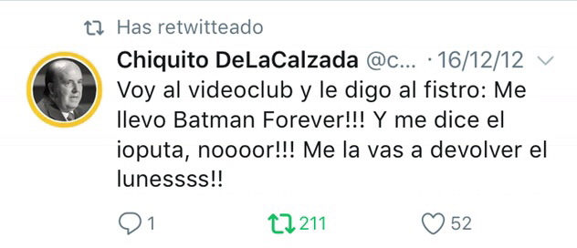 Ya habrá bastantes personas por ahí que alaben su vida. Pérez-Reverte, certero a veces, cuñado lenguaraz en otras ocasiones, le dedicó este hermoso artículo hace ya algún tiempo.1 Yo no sé demasiado en ese aspecto. Soy poco mitómano. Sé que Chiquito parecía una buena persona. Sé que trabajó mucho como cantaor para triunfar pasada la sesentena como humorista. Sé que tuvo mucho hater antes de que eso fuese una palabra y que acabó rindiendo a todo el mundo a sus pies. Y sé que si la academia de la lengua realmente recogiese la manera en la que habla la gente, el español de uso, «fistro» estaría en el diccionario, probablemente acompañado de otros vocablos como «norrr», y expresiones como «pecador de la pradera». Son vocablos que han superado la prueba del tiempo y del uso con más éxito que otras presentes en ese cementerio de palabras. Como cederrón. ¿Alguien dice cederrón, o conoce a alguien que lo diga? ¿O alguien que los use, ya que estamos?